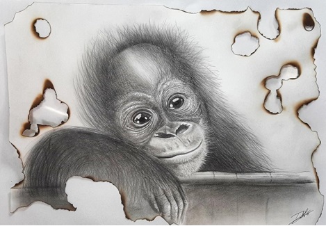 En éstas obras se muestra la crudeza de la caza furtiva, que ha llevado a la extinción de un animal tan común como lo era la jirafa africana o el orangután de borneo.