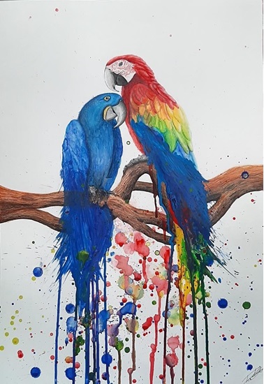 Esta obra representa expresamente el grandísimo abanico de fauna en peligro de extinción y de su entorno, en éste caso se representa el guacamayo azul que se encuentra con una extinción inminente y del papagayo tropical.